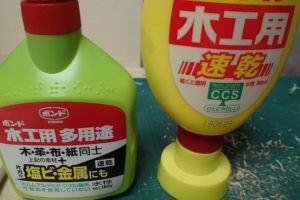 以前より、接着材は基本的には速乾 の木工用を使ってきました。 今回より、多用途の木工ボンドを使 っています。 |